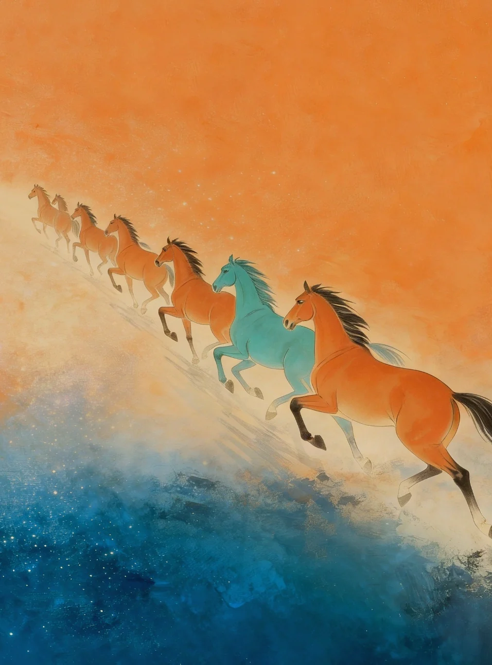 Глубокий синий цвет, переплетенный ритмичными мотивами лошадей, выражает ясность и внутреннее равновесие. Создан для тех, кто движется вперед с мыслью и целью — уверенно, сосредоточенно и целеустремленно. Найдите свой ритм. Сохраняйте спокойствие. Двигайтесь с целью.